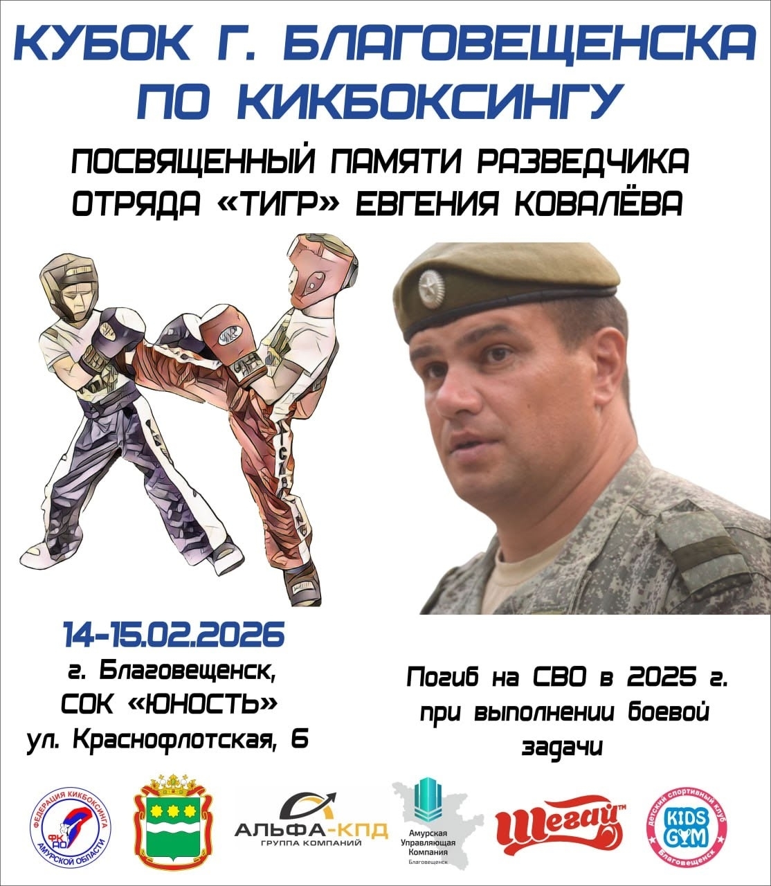 14 и 15 фестиваль пройдет открытый Кубок города Благовещенска посвящённый памяти разведчика отряда "Тигр" Евгения Ковалëва, который погиб на СВО в 2025 году при выполнении боевой задачи.